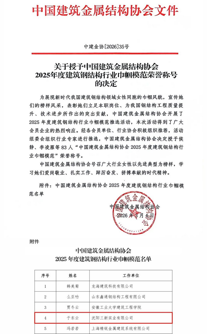 三月春風(fēng)拂面,巾幗芳華綻放。近日,中國(guó)建筑金屬結(jié)構(gòu)協(xié)會(huì)發(fā)布中建金協(xié)[2026]35號(hào)文件,授予全國(guó)83位行業(yè)女性“2025年度建筑鋼結(jié)構(gòu)行業(yè)巾幗模范”榮譽(yù)稱(chēng)號(hào),沈陽(yáng)三新實(shí)業(yè)有限公司董事長(zhǎng)于東云位列其中。在第116個(gè)“三八”國(guó)際勞動(dòng)?jì)D女節(jié)來(lái)臨之際,這份國(guó)家級(jí)榮譽(yù),是行業(yè)贈(zèng)予她的節(jié)日厚禮,是對(duì)她深耕建筑鋼結(jié)構(gòu)領(lǐng)域多年的匠心堅(jiān)守與卓越貢獻(xiàn)的權(quán)威認(rèn)可,更是對(duì)新時(shí)代女性企業(yè)家剛?cè)岵?jì)、勇立潮頭的最美褒獎(jiǎng)。